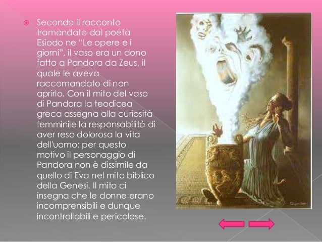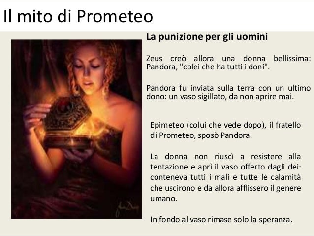 Audiostoria del mito del vaso di Pandora. Pandora non viene nominata esplicitamente ed è priva di ascendenza genealogica. El mito de cuando Prometeo robó el fuego para entregarlos a los hombres y de como Pandora al abrir su caja cumplió la venganza de Zeus. Zeus punisce Prometeo incatenandolo ad uno. Il vaso di Pandora: il valore phraseologism. Ma una sola cosa viene detta a Pandora, quel vaso doveva restare sempre chiuso e nessuno avrebbe mai dovuto guardare al suo interno.